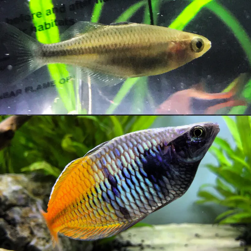The Boesemani Rainbow creates a colorful centerpiece for any freshwater home aquarium. Males have a beautiful bluish purple head that fades into a gorgeous orange and yellow posterior. Though females are not as colorful, their brilliant silver coloration is equally as stunning against any backdrop of plants or rockwork. Regardless of sex, however, Melanotaenia boesemani boasts the same distinct characteristics as other Rainbowfish, including large eyes, a deeply forked mouth, and dual dorsal fins. Like many members of the Melanotaeniidae family, the Boesemani Rainbow also boasts the characteristic blackish-silver band of scales running laterally from gill to tail. This peaceful Rainbow is a schooling fish that does best in a planted aquarium with plenty of room to swim. please note the fish you will get are not fully mature and will not be fully coloured up when you receive them but they will colour up fairly quickly once they settle in