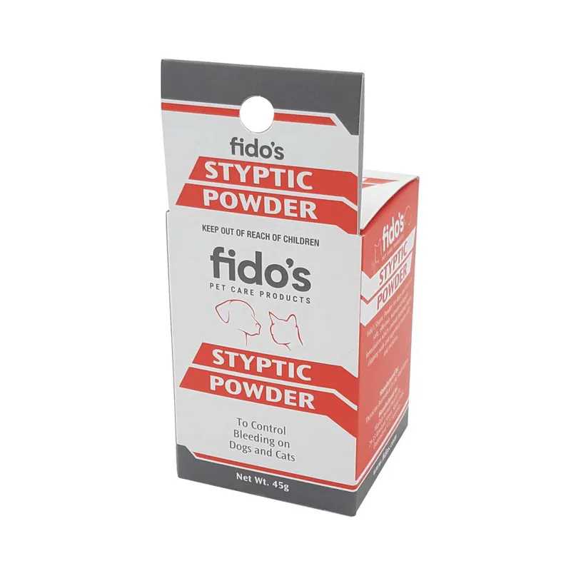 Fido's Styptic Powder is a safe, effective, fast-acting formula which controls bleeding due to clipping nails, and superficial minor cuts and incisions.