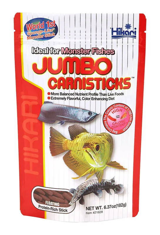 Hikari Jumbo Carnisticks are spongy pellets that float and absorb a portion of water.