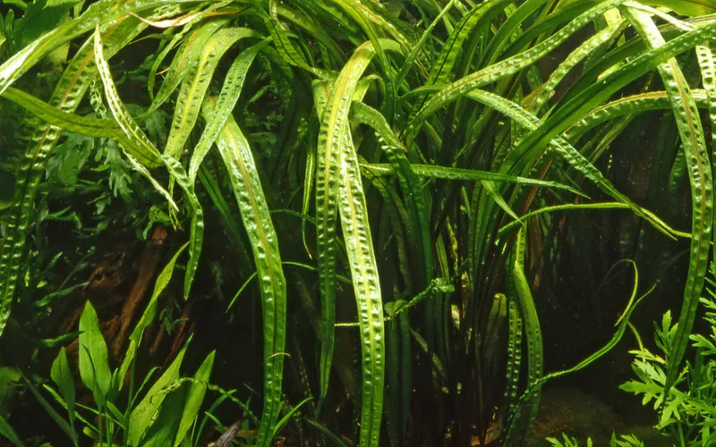 Leaves becomes 20-60 cm long and the single roset plant becomes 15-20 cm wide. Place it in the rear part of the tank, from where the leaves may float beautifully on the water surface. The leaves are either entirely green or maroon.